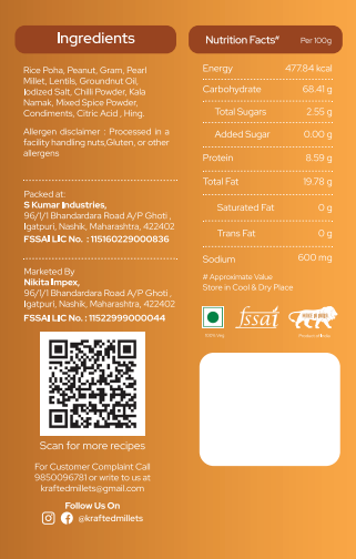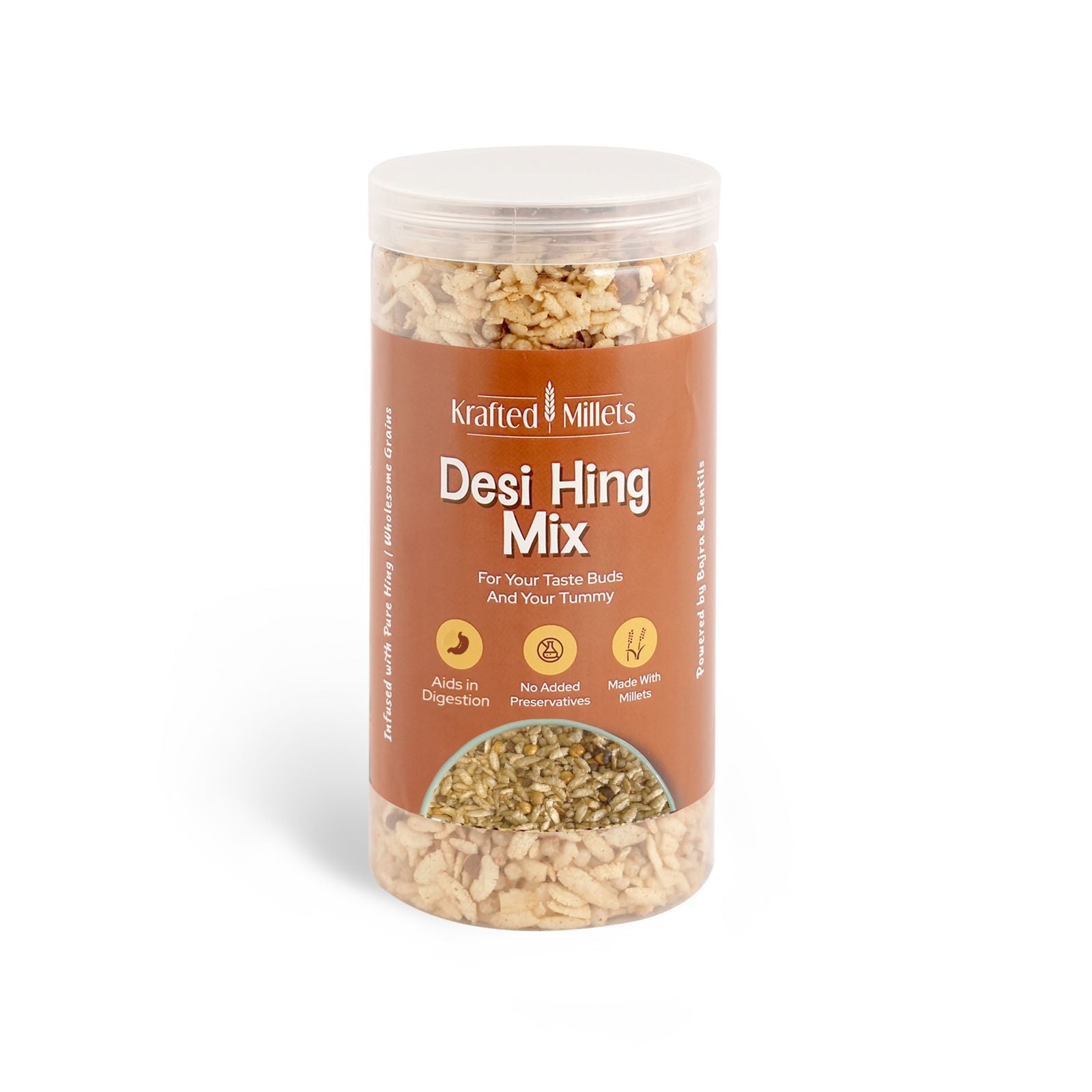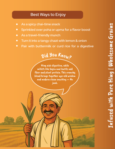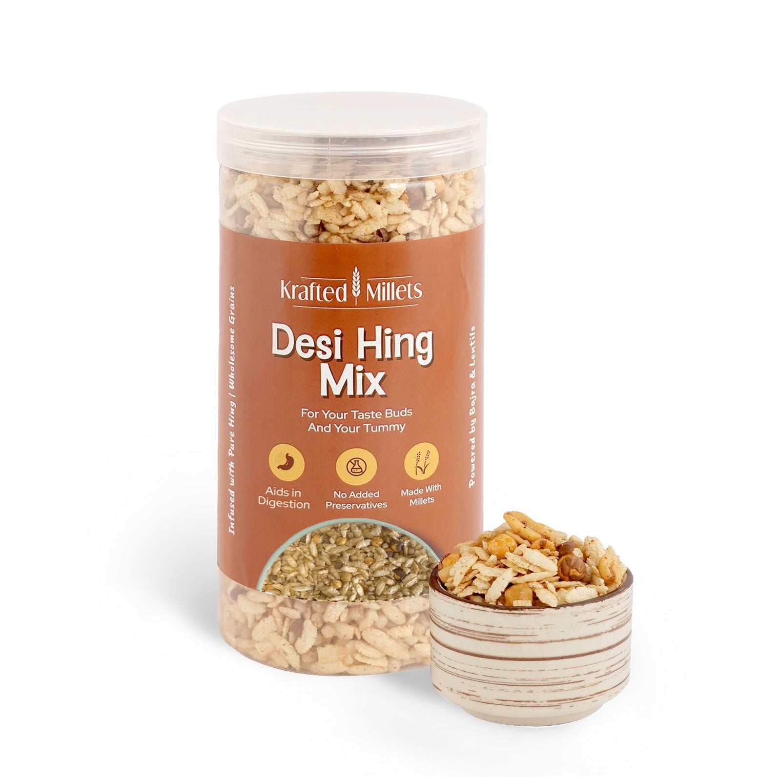 A bold fusion of Indian tradition and modern clean snacking, Krafted Milletsโ Desi Hing Mix is infused with pure asafoetida (hing) and packed with wholesome grains like bajra, lentils, and millets. It's gluten-free, preservative-free, and made for people who crave flavor with benefits.