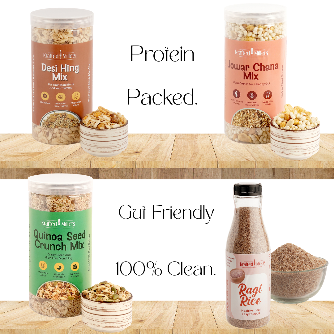 A thoughtfully curated combo of Krafted Millets’ bestselling clean snacks and staples — perfect for your daily nutrition. Whether you're looking for high protein, better digestion, or just a guilt-free crunch, this pack has it all.