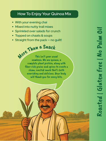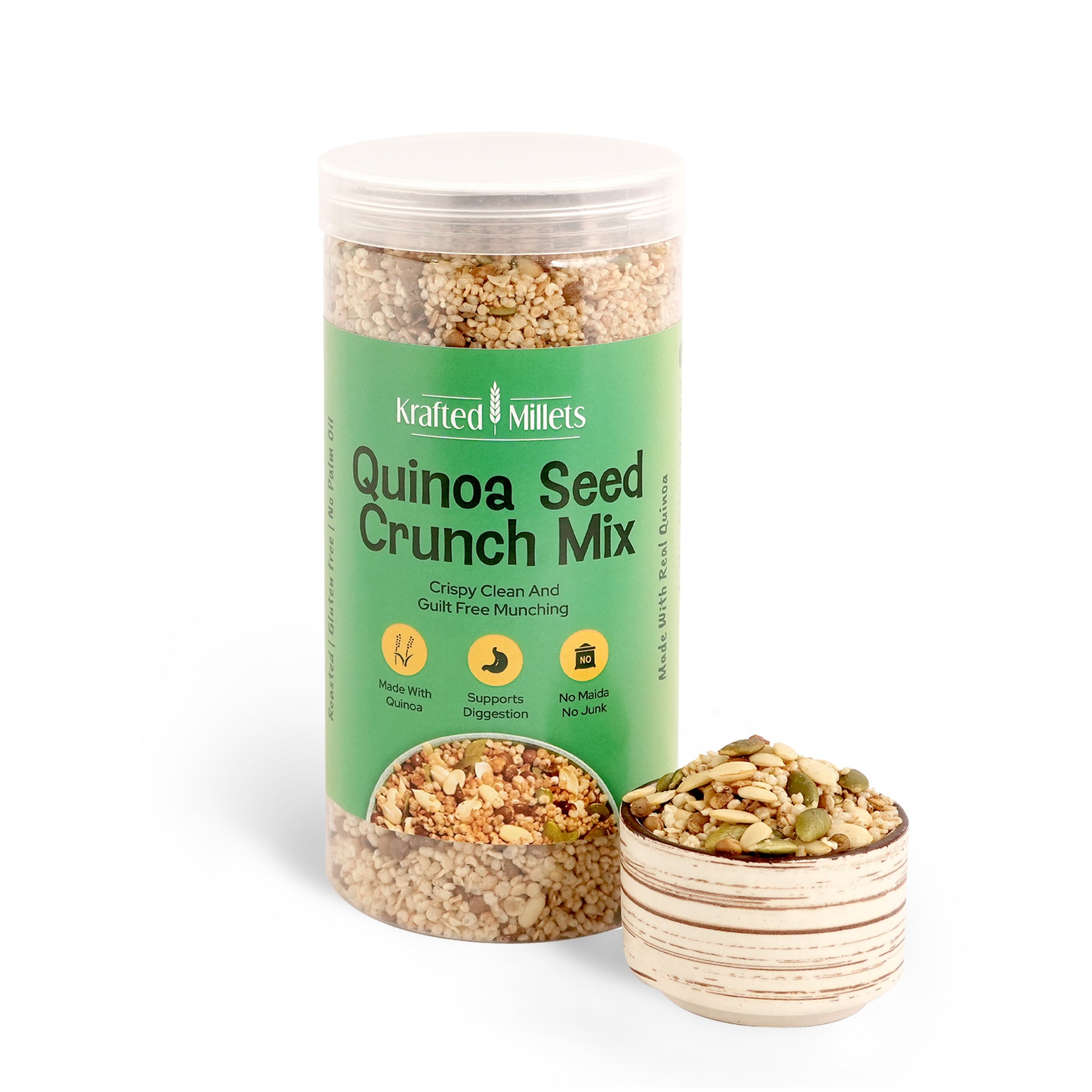 Looking for a clean, protein-packed snack that your gut will love? Krafted Millets’ Quinoa Seed Crunch Mix brings you the power of plant protein from real quinoa, blended with roasted seeds, lentils, and mild spices for a crunchy experience that’s as wholesome as it is tasty.