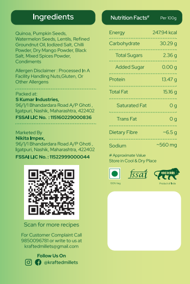 Quinoa, Pumpkin Seeds, Watermelon Seeds, Lentils, Groundnut Oil, Spices & Seasonings (iodized salt, chili, mango powder, black salt, etc.)
